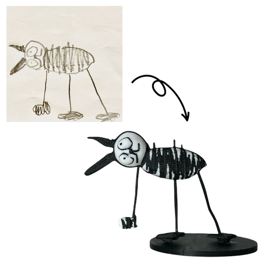 私たちのサービスでは、お子さまの描いたイラストをそのまま立体のフィギュアにすることができます。額縁に入れて飾るのとはまた違う、「触れられる思い出」。